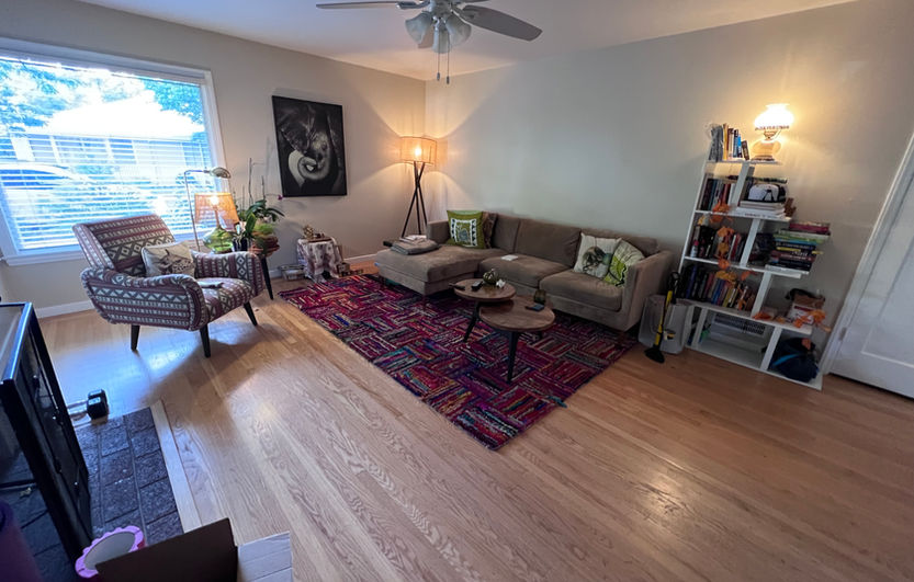 The front unit has one-story with two bedrooms, a full bathroom, dining room off of the kitchen and large living room with fireplace.